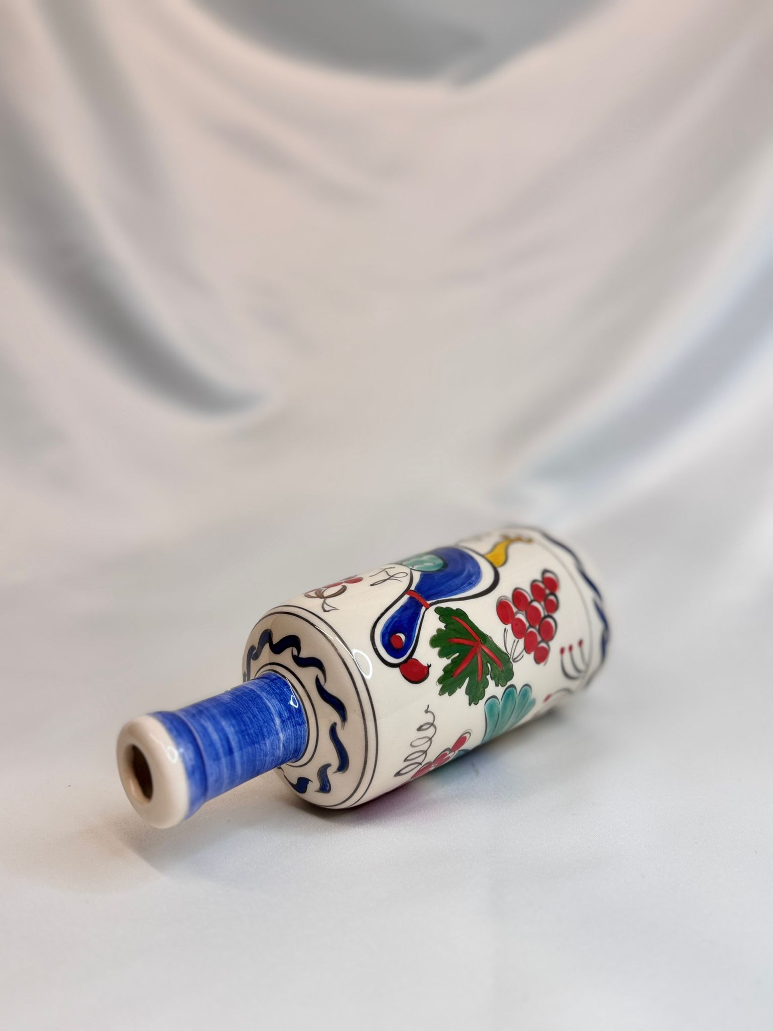 Bu el yapımı seramik şişe, parlak beyaz zemin üzerine işlenmiş renkli şekillerle hem mutfaklarınızda hem de dekorasyonunuzda neşe dolu bir odak noktası oluşturacak. Ürün formülü, çok amaçlı yazılım olanakları tanırken, üzerinde bulunan desene ait bir değer katmaktadır.