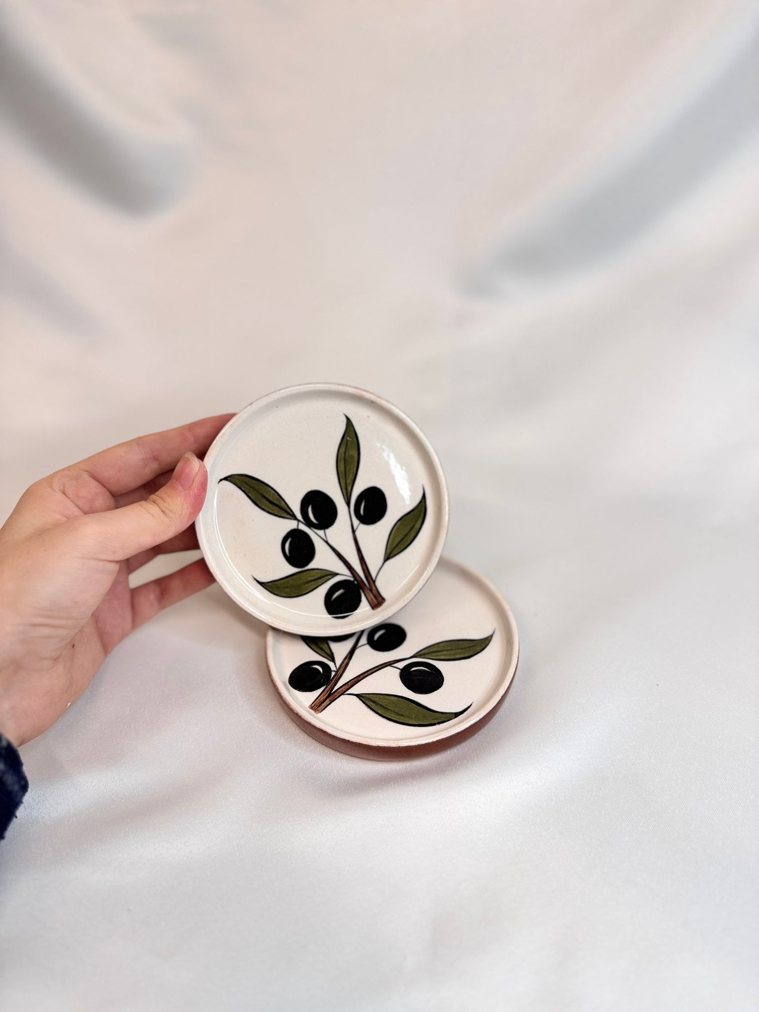 Zeytin Dalı Motifi: Parlak beyaz seramik zemin üzerine, kalın siyah zeytinler ve koyu yeşil yapraklardan oluşan stilize zeytin dalı motifi, el boyaması tekniğiyle işlenmiştir. Bu motif, sadeliği ve asaleti temsil eder.