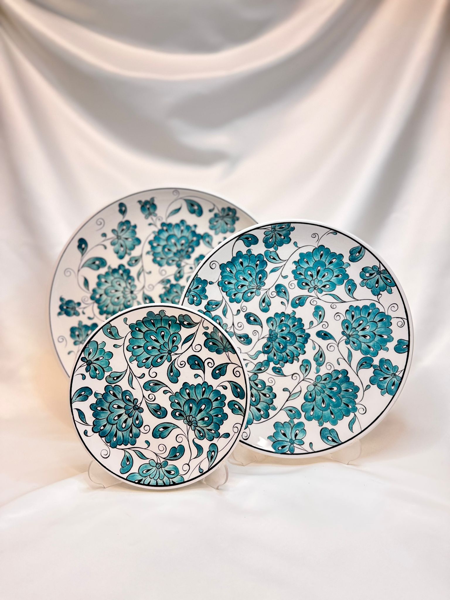 El Yapımı Seramik 3’lü Tabak Seti: “Turkuaz Çini Bahçesi”