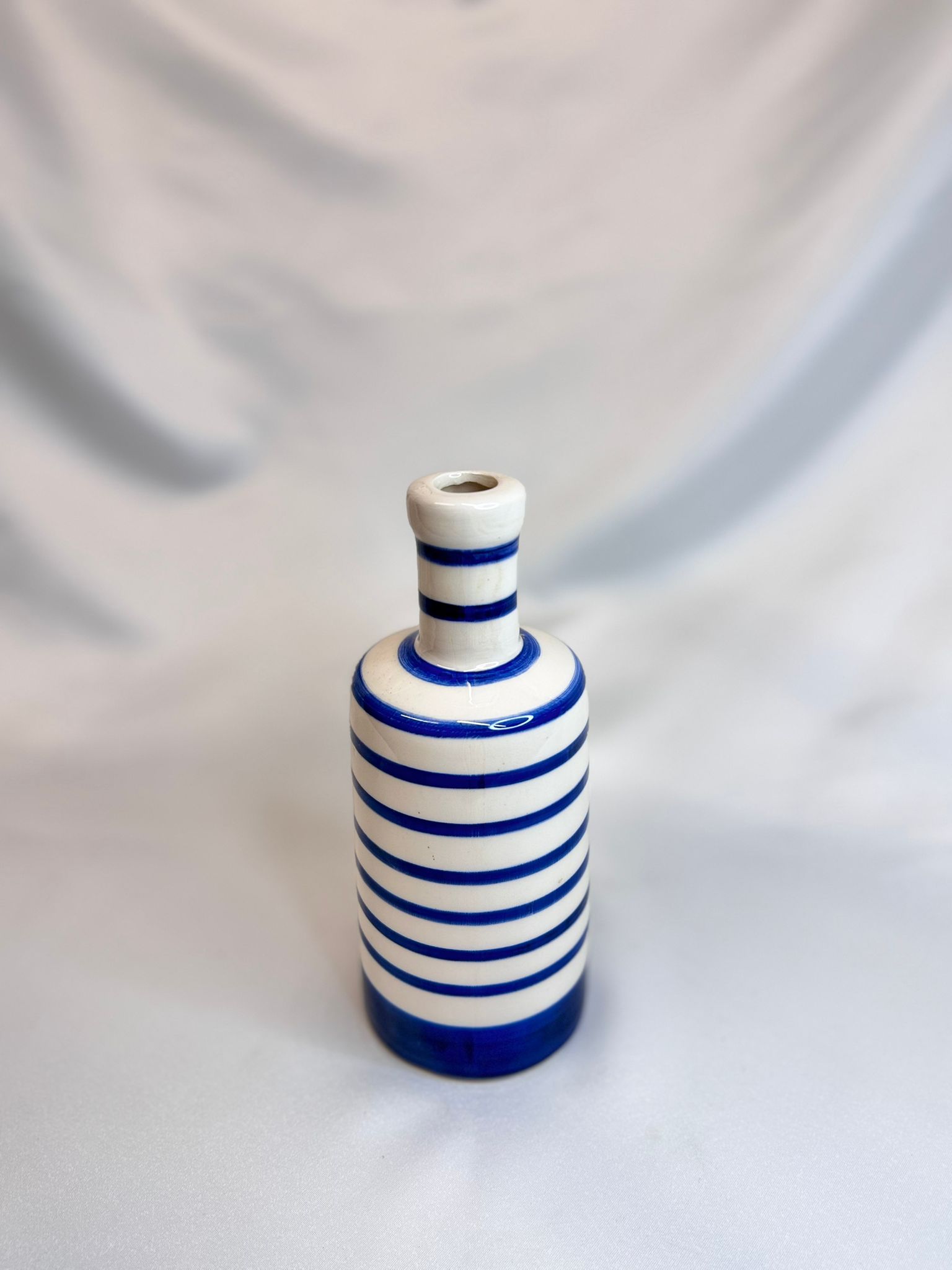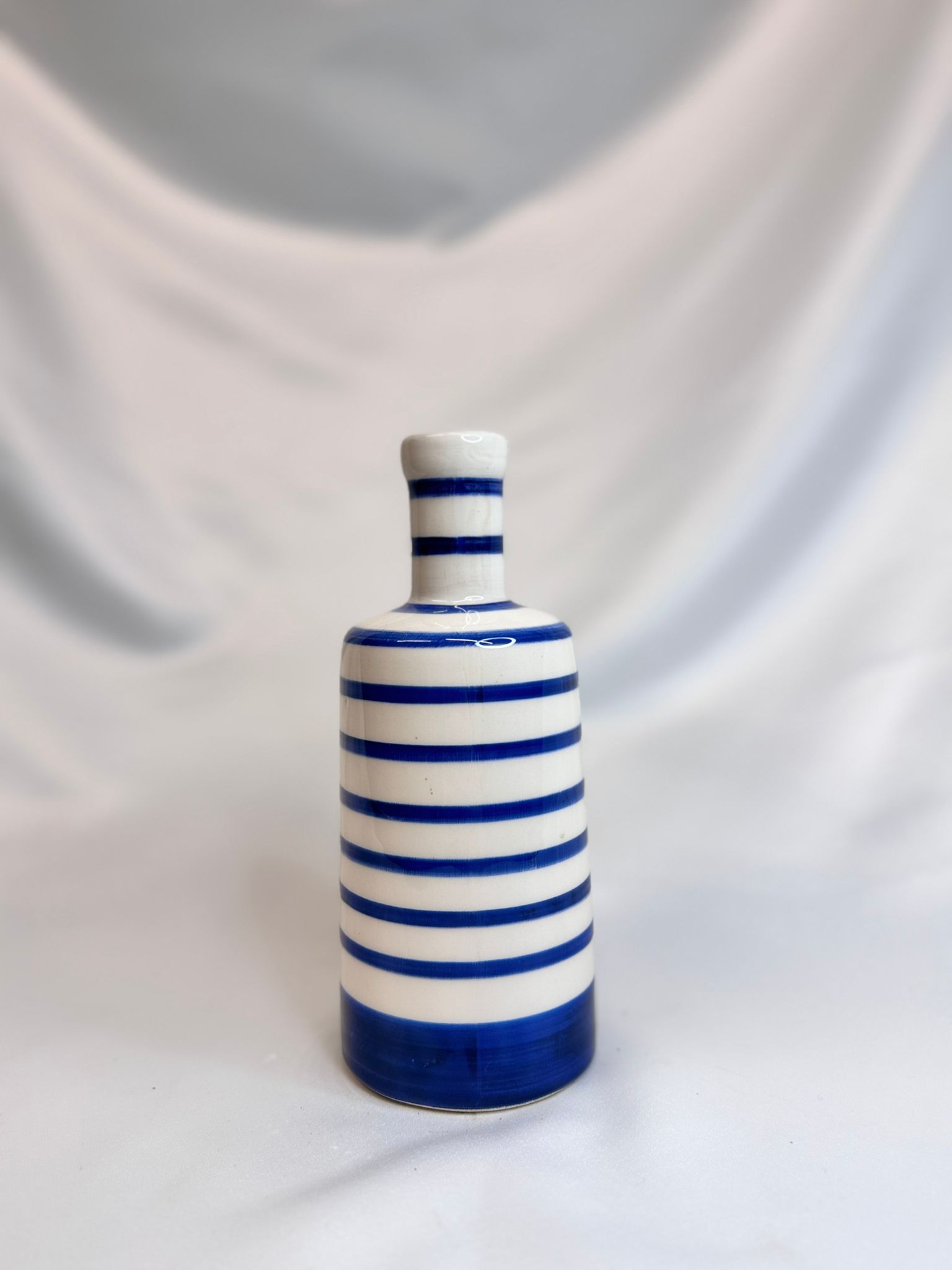 Bu el yapımı seramik şişesi, sade ve net çizgisel deseniyle her türlü dekorasyona kolayca uyum sağlar. Özellikle denizdeki veya minimalist mekanlar için mükemmel bir seçimdir; hem mutfakta hem de dekorasyonda mevcuttur.
